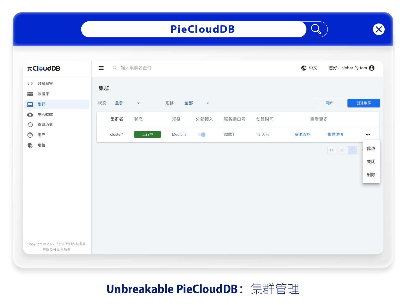 PieCloudDB 为用户提供了集群操作管理和集群精细化管理模块,支持将创删集群等操作分配给不同角色来实现集群权限管理,拥有授权的用户可以按需对集群进行扩容或缩容、启停或删除等操作.。