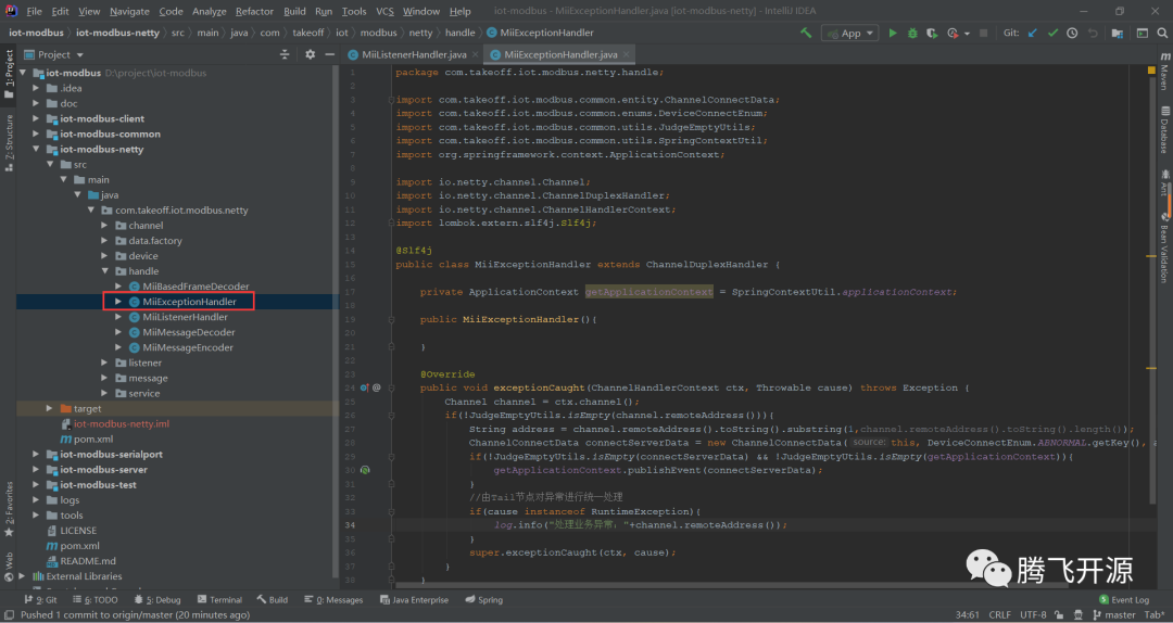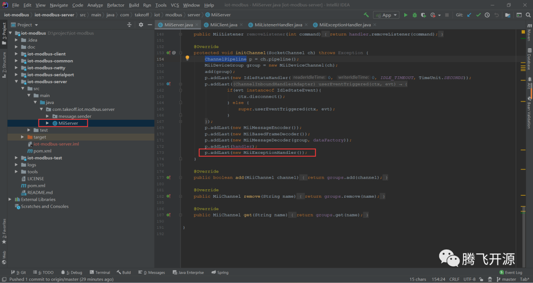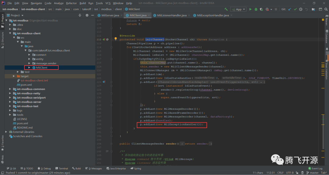 主要是增加了MiiExceptionHandler处理器,并在服务端MiiServer和客户端MiiClient初始化initChannel时添加进入。