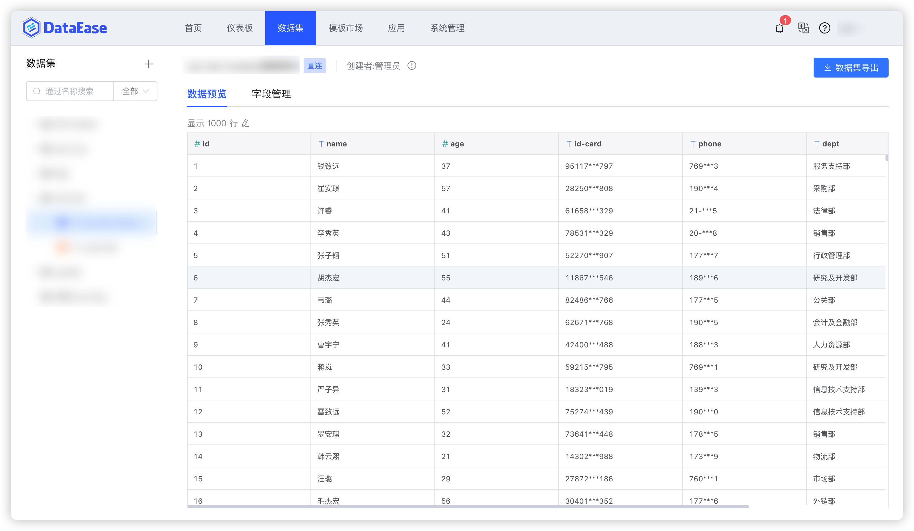 在v1.17.0版本之前,DataEase为数据集数据提供了简单的脱敏处理功能,可以将指定字段的源数据用“*”号进行替代展示。但在某些情况下,用户希望一些类型的数据仅屏蔽关键部分的信息,而非完全屏蔽所有信息,例如屏蔽身份证号、手机号、人名等。用户仅需隐藏这些数据的中间部分,这样既可以看到省份、手机归属地等信息,又很好地把生日、具体号码、姓名等隐私信息进行了脱敏处理。