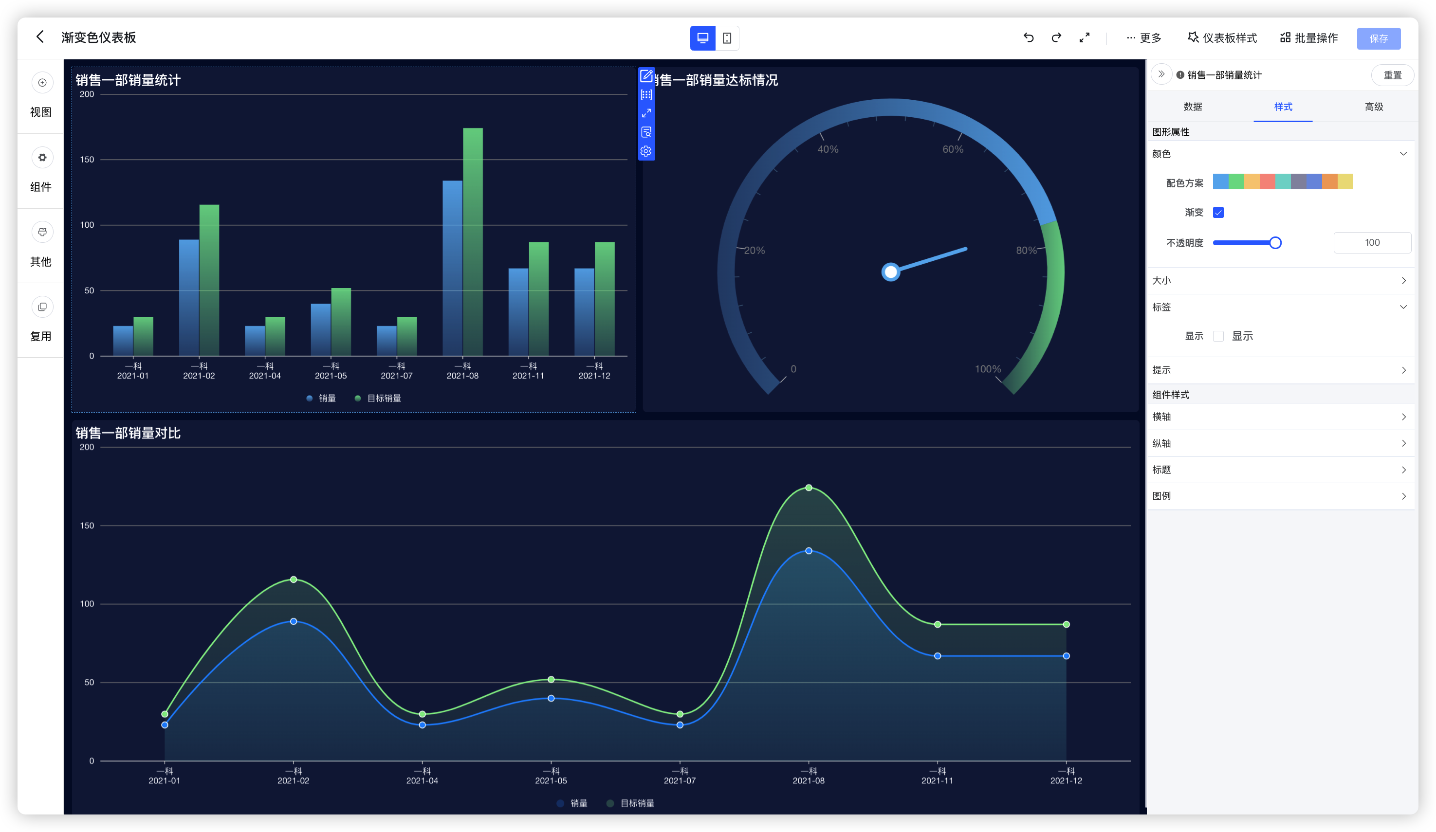 数据可视化工具除了清晰准确地表达数据内在意义以外,良好的展示效果对于用户的使用体验也很重要。在v1.17.0版本中,DataEase对AntV图库中的所有柱状图、面积图以及仪表盘均增加了渐变色的支持,丰富了这些图表类型的展示效果。
