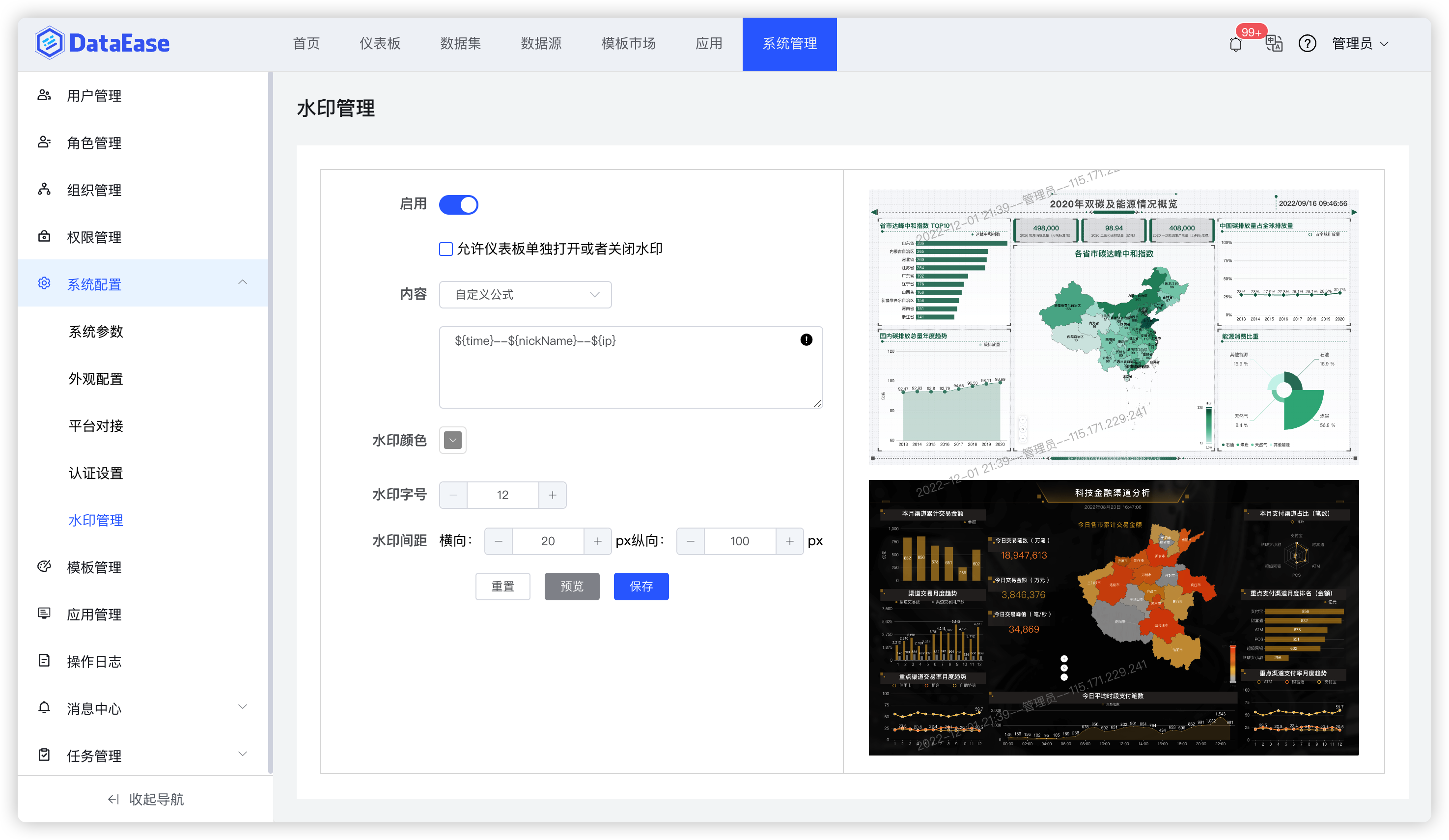 在v1.17.0版本中,DataEase加入了对水印设置的支持,用户可以将DataEase账号、昵称、IP和系统当前时间进行自由组合,形成水印内容。设置的水印将会影响所有仪表板展现的场景,包括仪表板预览、报告、PDF导出等。对数据安全具有较高要求的用户,还可以强制要求所有仪表板必须带有水印。