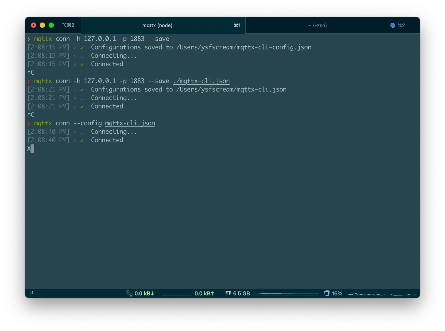 MQTT X CLI 命令行客户端在之前的版本中,每次连接都需要手动输入连接参数,这样会导致用户每次连接都需要输入一遍参数,比较繁琐。因此,我们在该版本中新增了读取和存储本地配置文件的功能。用户可以将连接参数保存到本地配置文件中,下次连接时可以直接读取本地配置文件中的参数,无需再次输入,且支持对所有 CLI 中的命令进行保存。