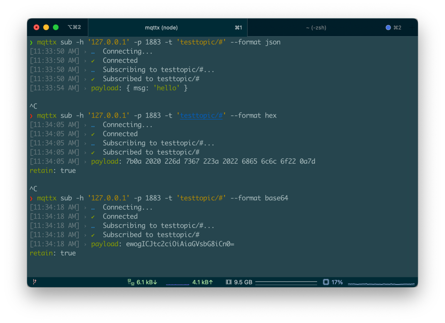在之前的版本中,MQTT X CLI 命令行客户端只支持发送字符串类型的消息,当用户发送 Hex 类型的消息时,接收到的消息转换为字符串显示时就会出现问题。因此 MQTT X CLI 命令行客户端在该版本中新增了消息格式转换的功能,用户可以在接收消息时指定消息的格式。