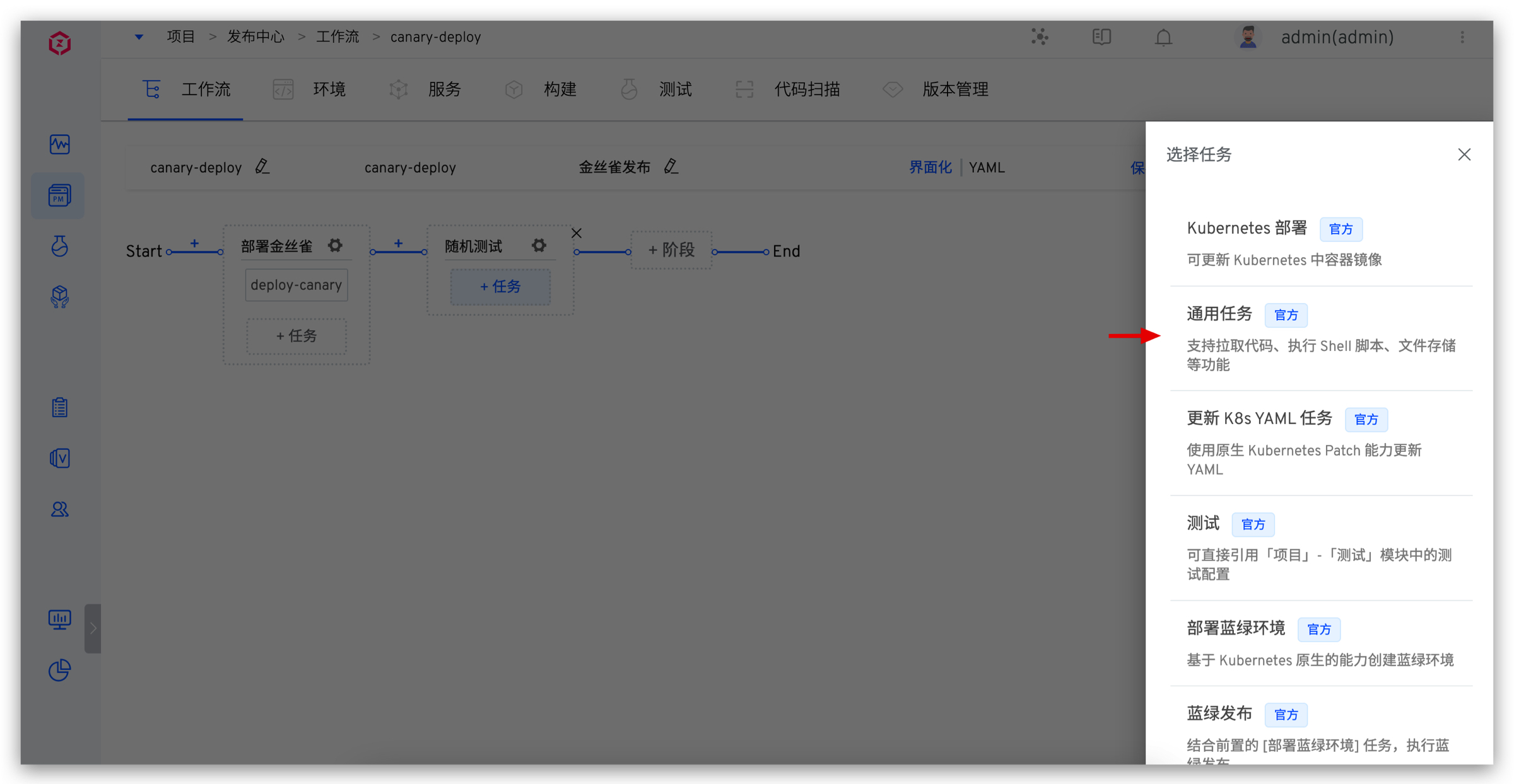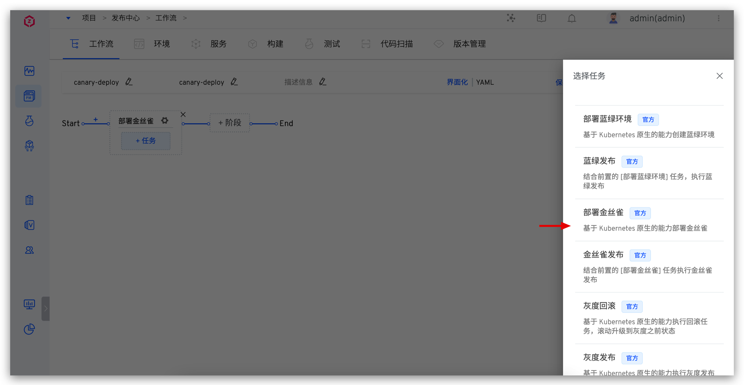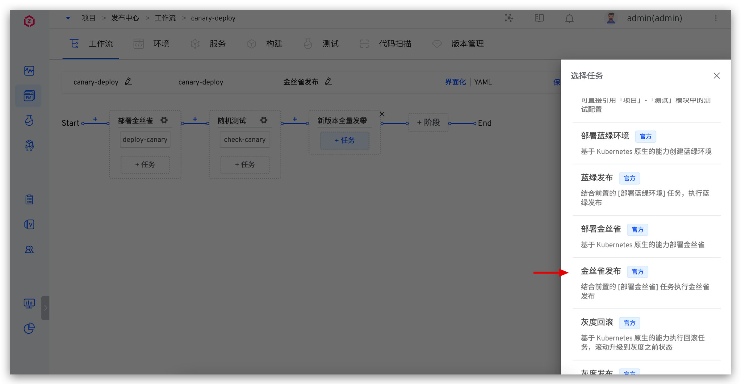 5. 添加金丝雀发布任务。点击「+任务」,选择「金丝雀发布」并配置。