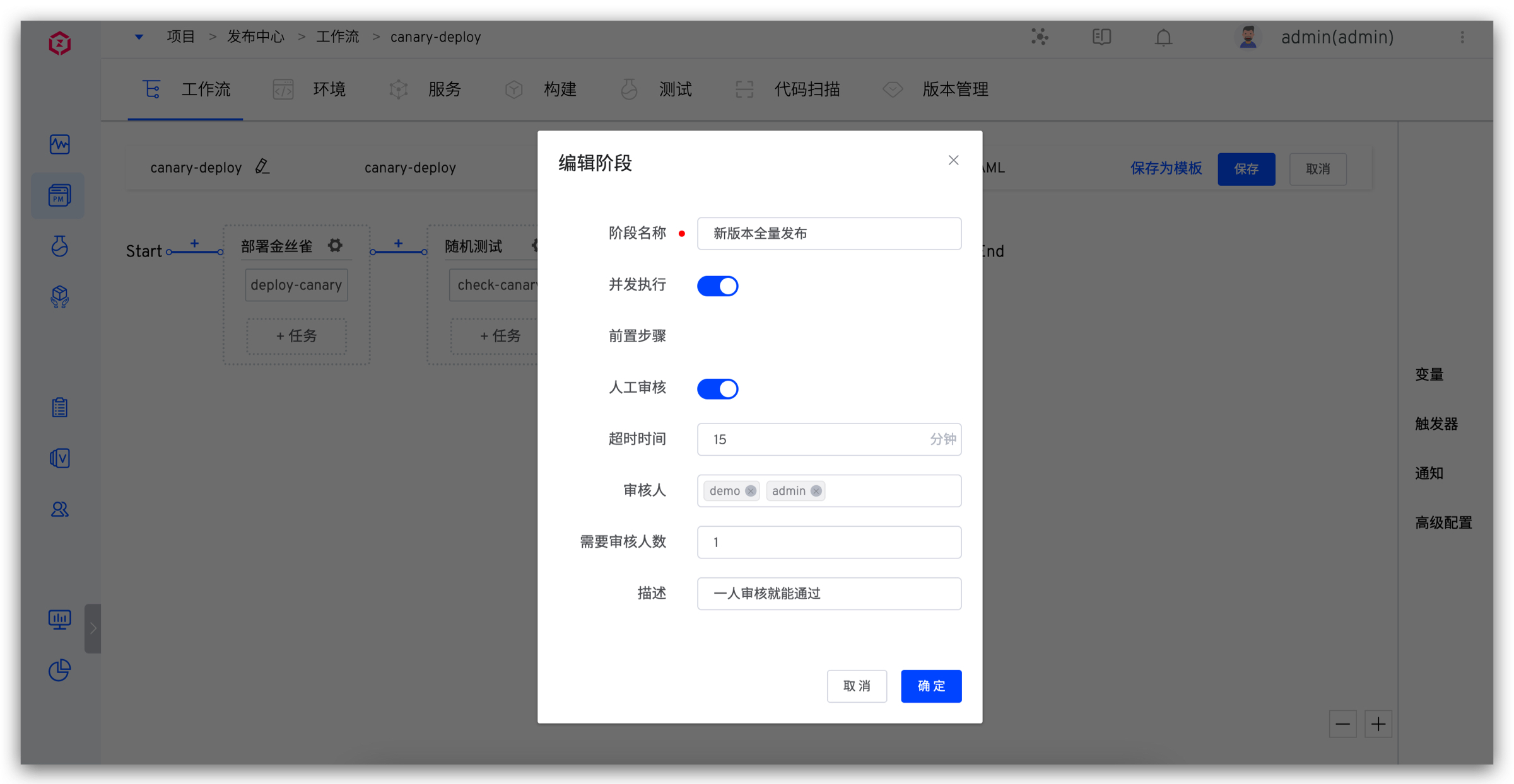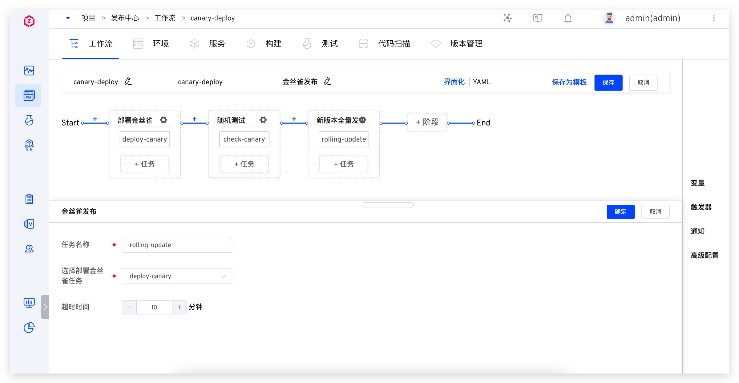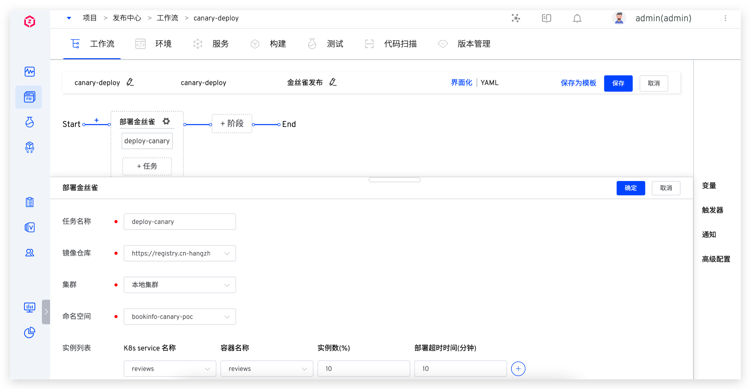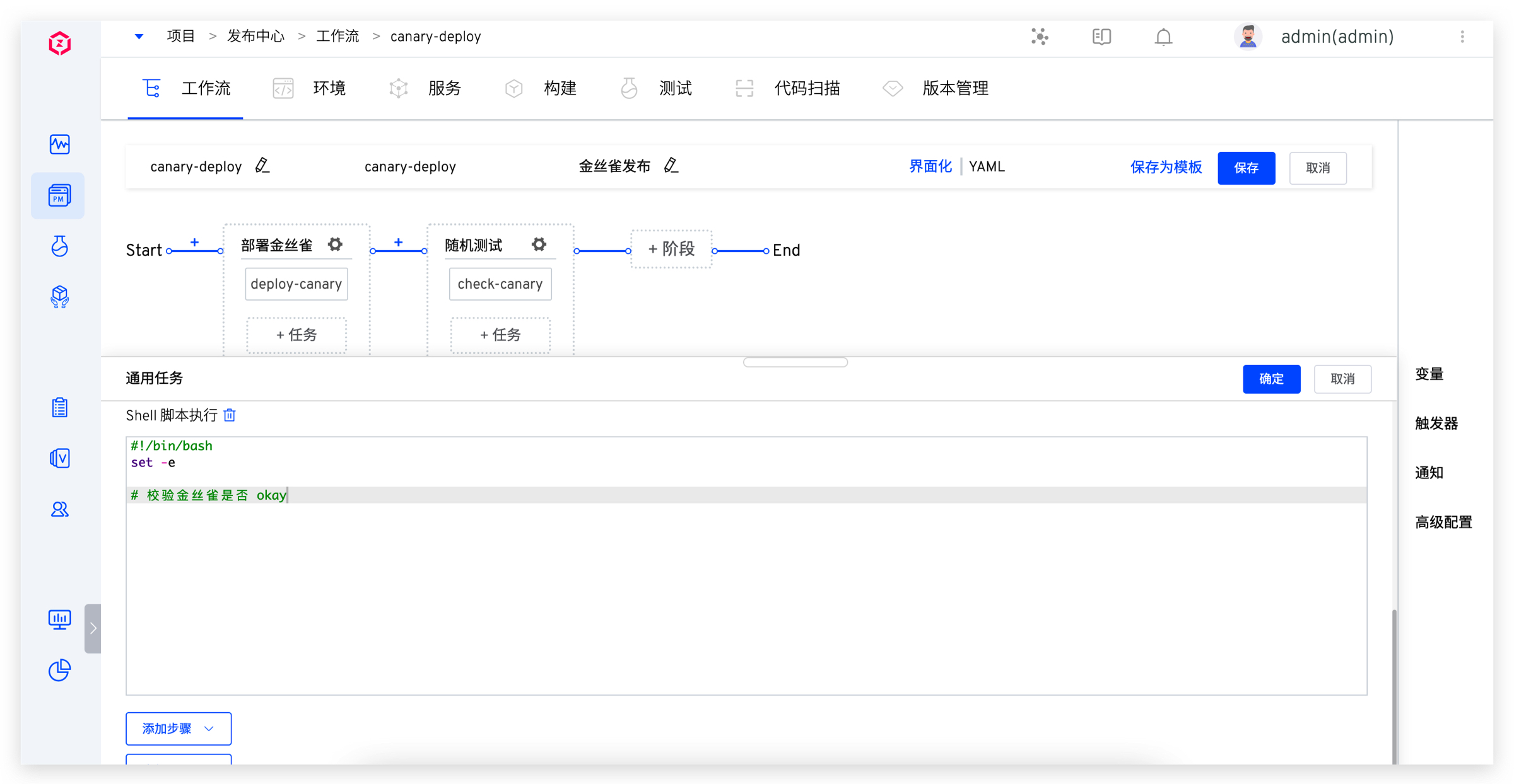 5. 添加金丝雀发布任务。点击「+任务」,选择「金丝雀发布」并配置。