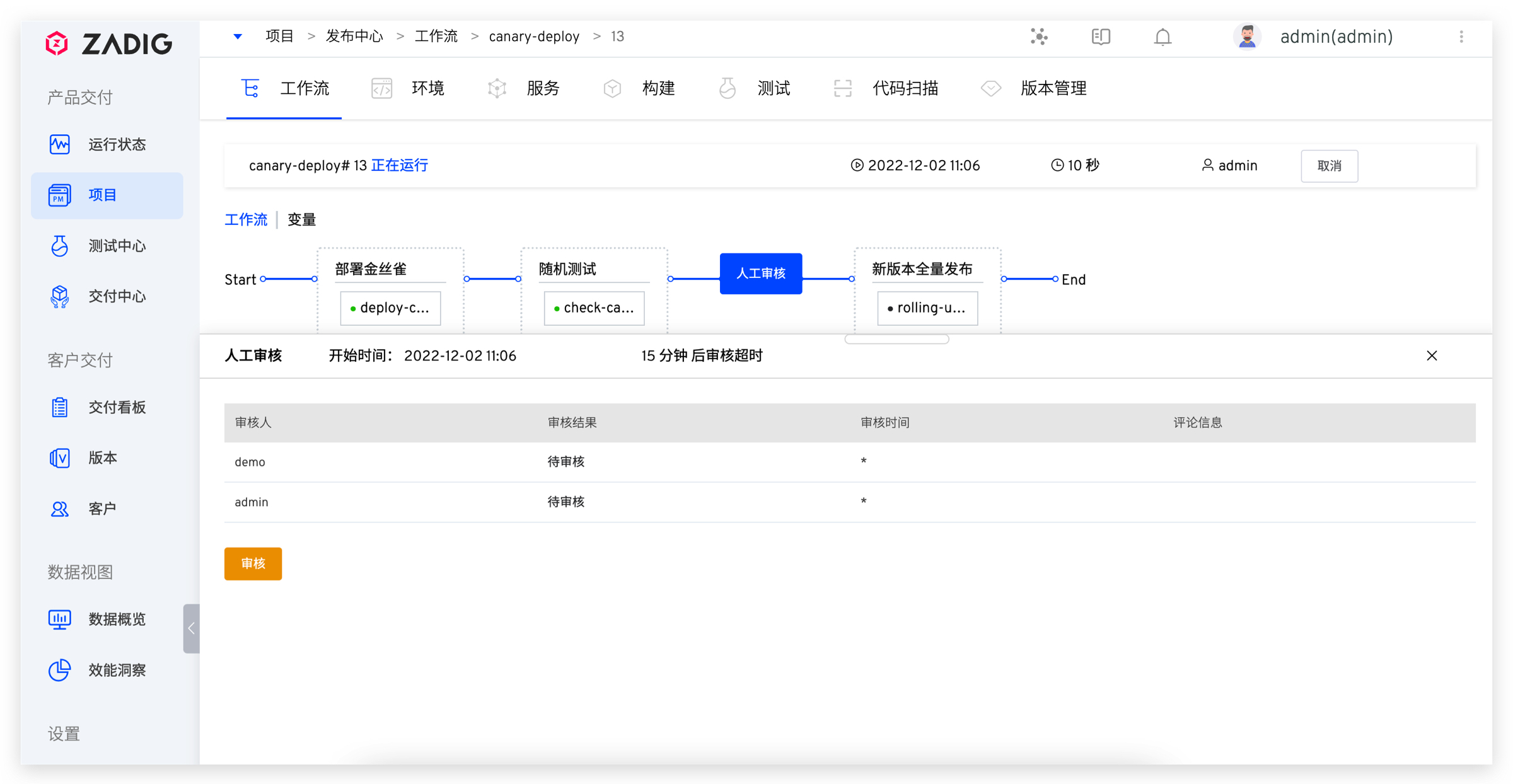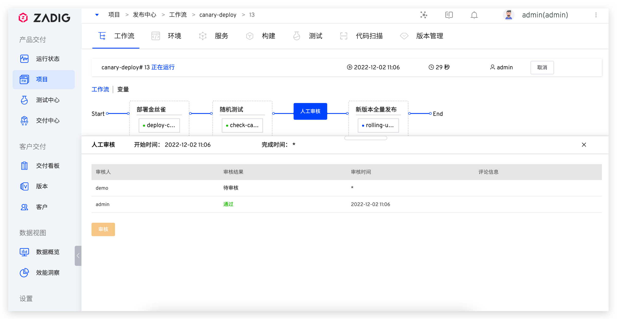 2. 工作流完成部署金丝雀和验证任务,等待人工审核。此时环境中已部署 1 个金丝雀实例,如下图所示。