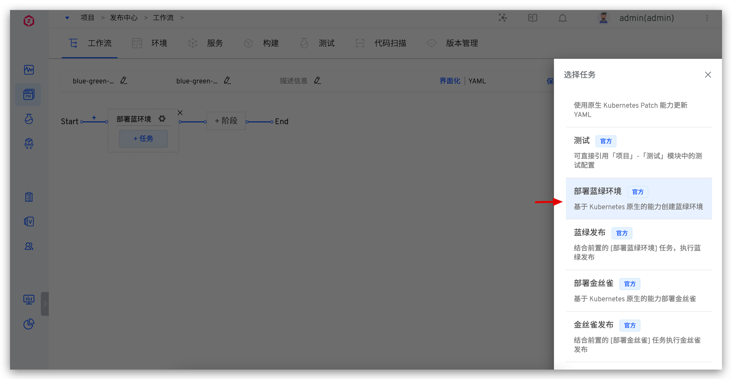 4. 添加蓝绿发布任务。点击「+ 任务」,选择「蓝绿发布」任务并配置。