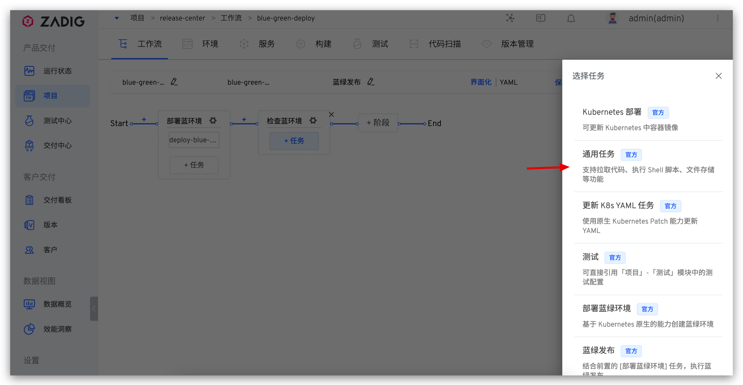 3. [可选]添加验证任务,验证蓝环境质量是否符合上线要求。点击「+ 任务」,选择「通用任务」任务并配置。