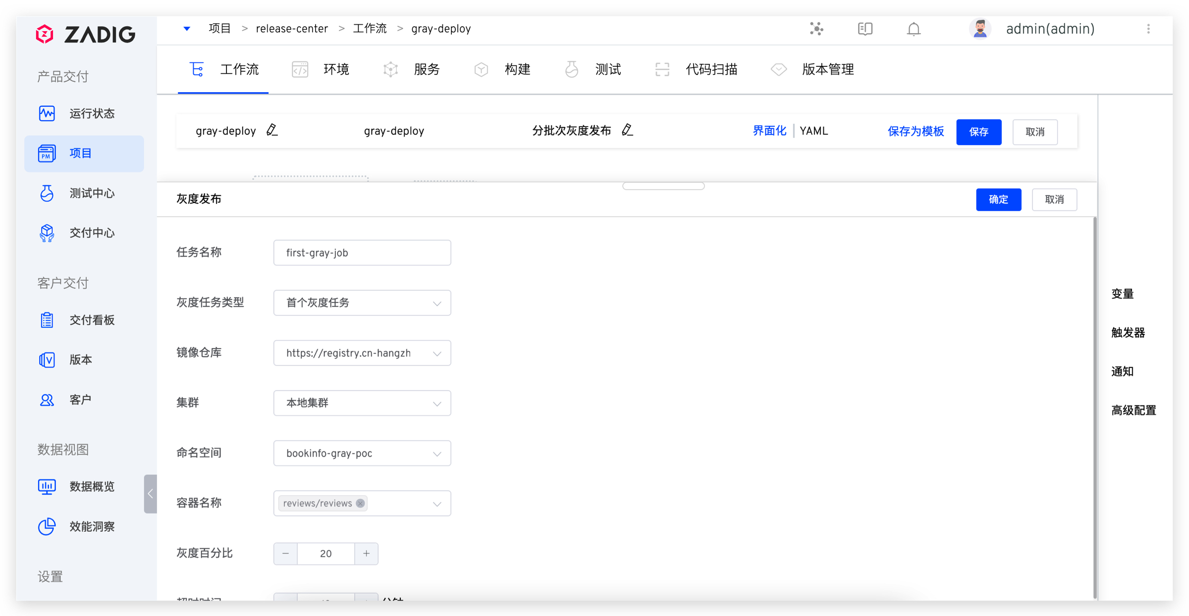 灰度发布有很多种实现方式,除了金丝雀发布,Zadig 还支持分批次灰度发布,按照实际情况,分多次升级线上服务,比如第一次灰度 20%,将生产 20% 流量打入新版本,通过监控观测线上流量情况,第二次灰度 40% ,观测流量,没问题后全量上线。