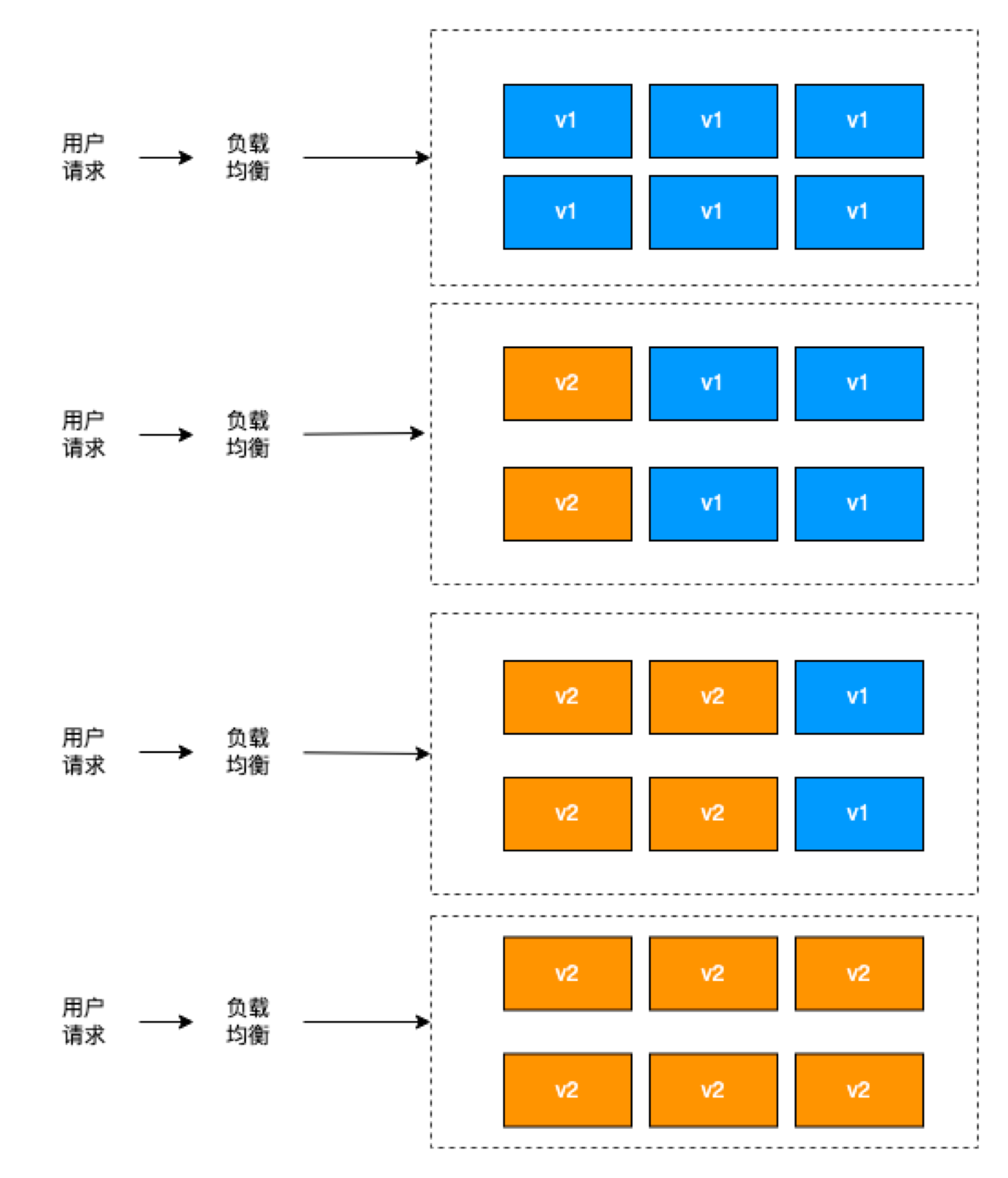在金丝雀发布基础上的进一步优化改进,是一种自动化程度较高的发布方式,用户体验比较平滑,是目前成熟型技术组织所采用的主流发布方式。