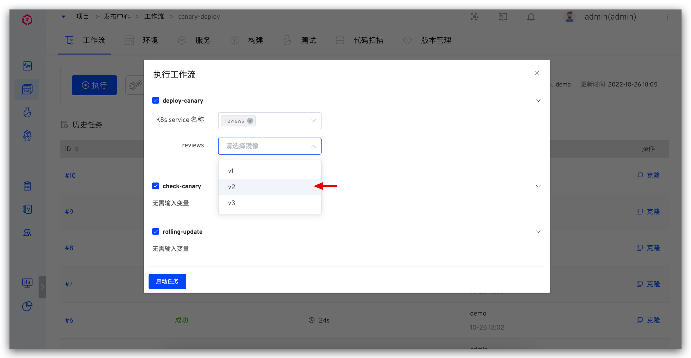 1. 点击「执行」按钮,选择需要灰度的容器及其镜像。