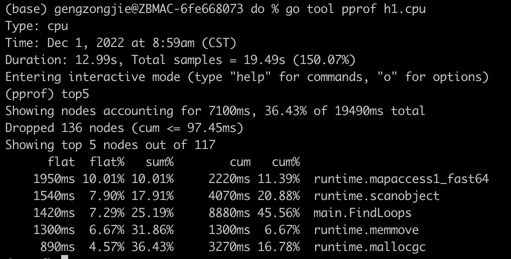 可以看到,pprof数据采集持续了12.99s,采样时长是19.49s(还是两核的缘故)。