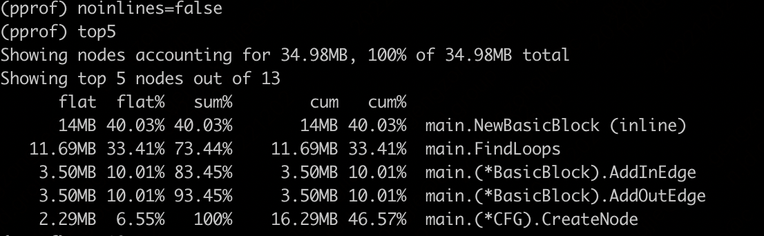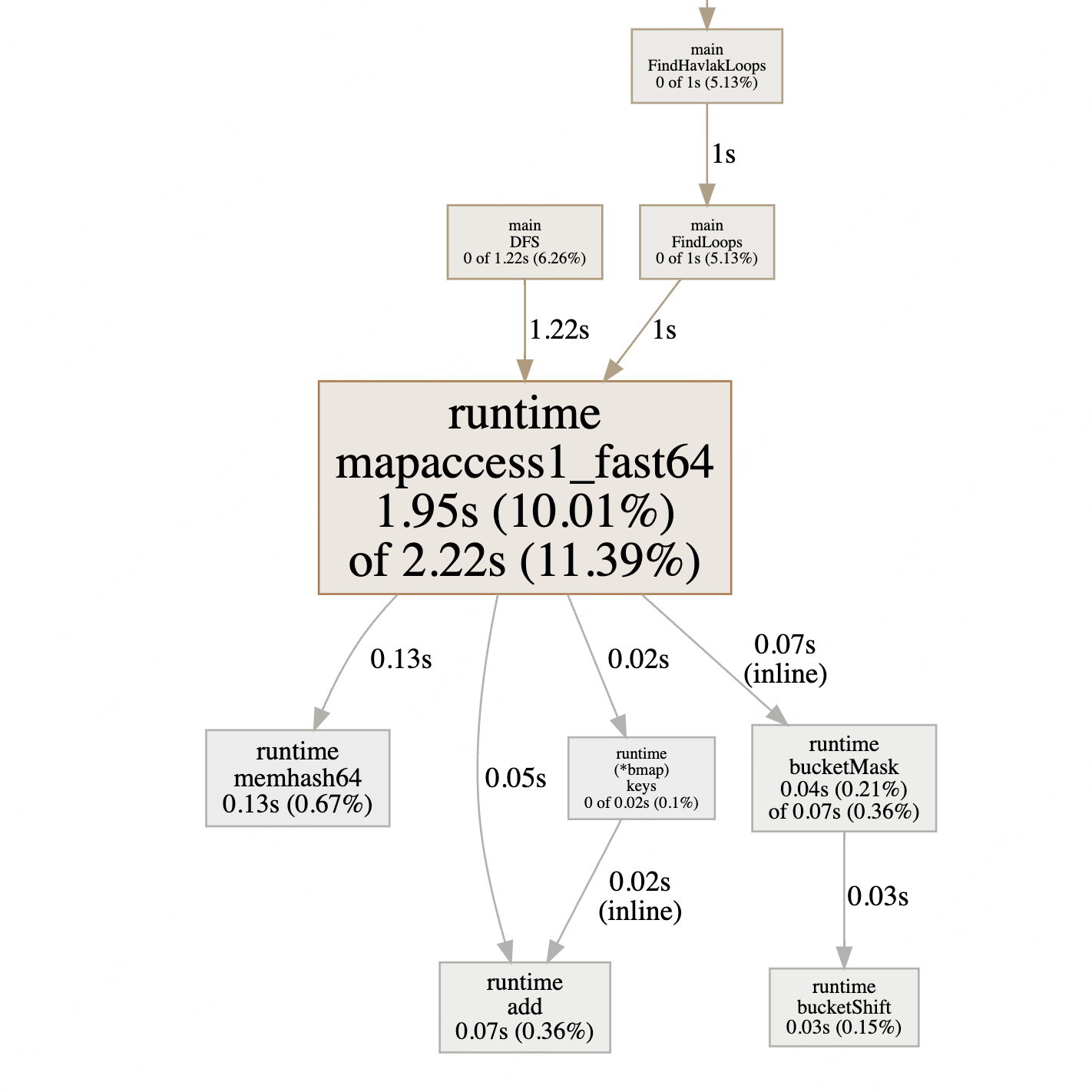 耗时最多的是mapaccess1_fast64,这是运行时中的map读写时的数据查询函数。如果编译程序时没有禁用内联,看到的会有所不同,其中会显示FindHavlakLoops函数,并标识为inline。因为FindHavlakLoops里面就调用了FindLoops,所以在编译器会直接把这个函数展开,用FindLoops替换FindHavlakLoops函数。也可以在不禁用内联编译时,设置pprof的noinlines开关为true,默认为false,即noinlines=true。