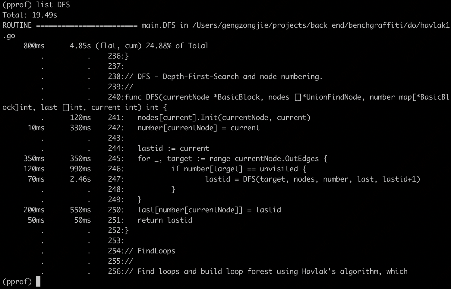 可以看到,DFS函数里耗时较长又是map操作的,是242 246 和250三行。对于这里的优化方法,是用list结构代替map结构,因为能用list达到效果的情况下没必要用map。这个咋一看没问题,但好像又有点别扭对吧?其实是因为这个程序的本身特点,这里有明显的一点,就是BasicBlock结构的特殊性,本身的Name属性就是自身的索引下标。查找某个BasicBlock不需要使用map来记录,直接通过下标访问显然是最低的时间复杂度(关于map和list的时间复杂度就不多说了,map看起来是O1,但其实没有考虑hash计算本身的过程和解决hash冲突的成本,而list是必然的O1)。通过把这部分的map修改为list数据结构,版本H2,再编译查看耗时情况: