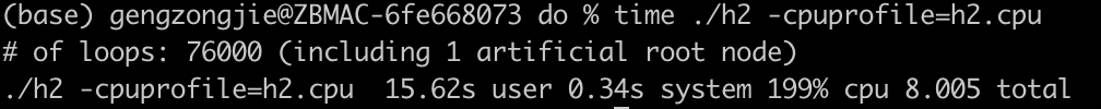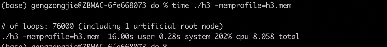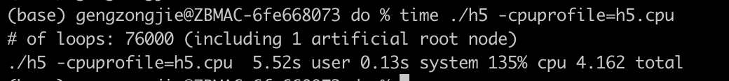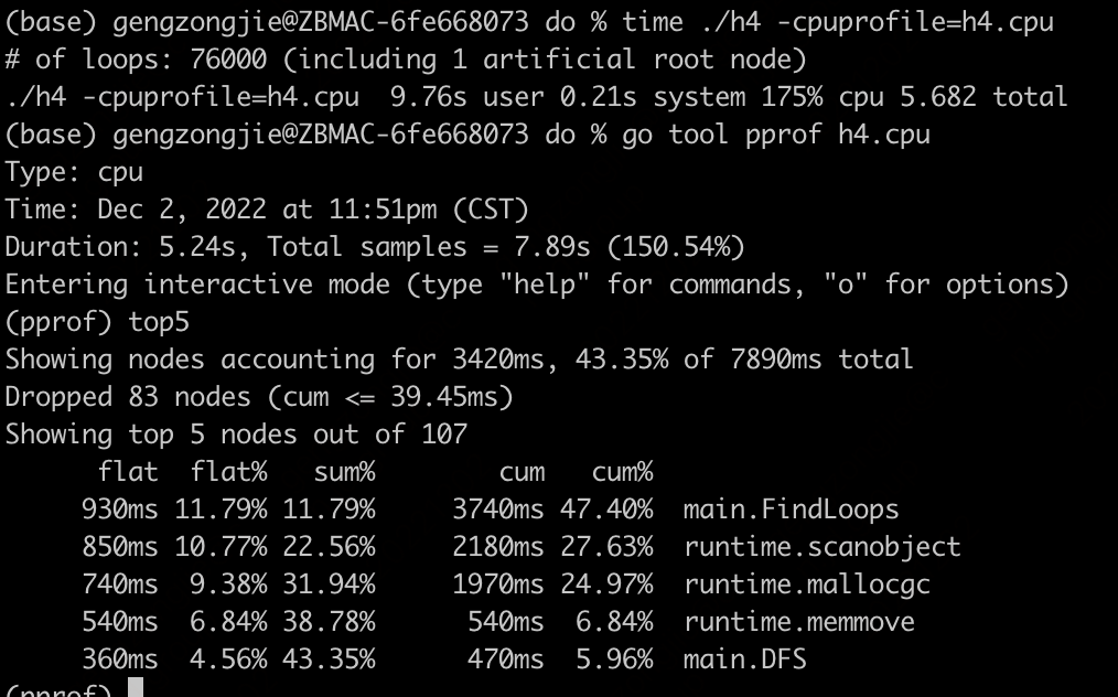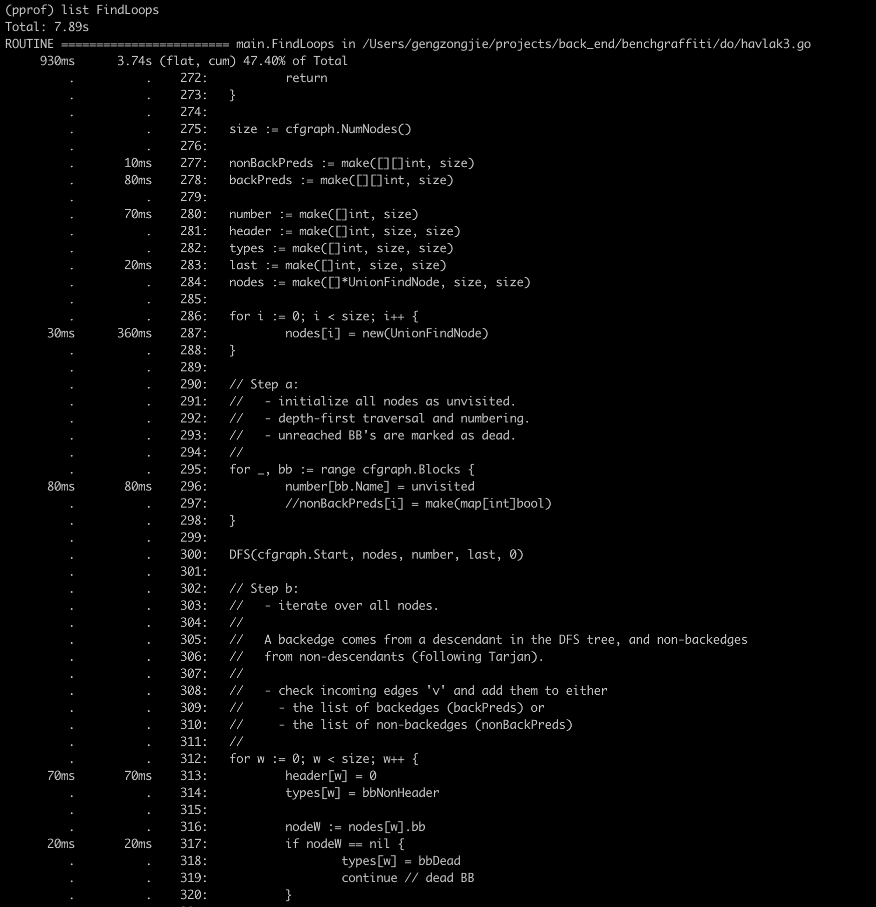 可以看到,节点创建是第一,FindLoops是第二。因为创建BasicBlock首先很简单,没有复杂的过程,其次这是程序中的一个基础对象结构,若要改结构体,那可能涉及到算法也得改,这个显然是不合适的,不仅可能改出bug,还可能收益不高。那我们就顺着看第二位的FindLoops,这个就是前边我们看到的调用mapaccess内置函数的另一个业务函数,所以优化的方法跟上面类似,还是优化map的使用,替换为list。这里有一点特殊的是,替换成list之后,map的追加需要改一下,加一个判断重复的逻辑,所以新加了一个appendUnique方法。再次编译,版本H4,查看耗时: