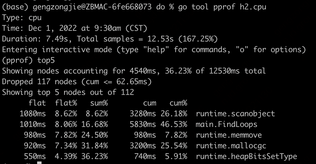 可以看到,FindLoops成为top1,scanobject函数成了第二位。这就对了,因为我们就是要让cpu更多的去运行业务代码,把时间花到真正需要的地方。