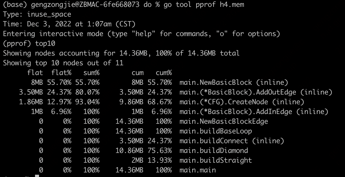 可以看到,top1变成了scanobject函数,不再是map读写了。看到这个函数,以及下边的mallocgc,我们要知道,这都是内存相关的,前者是内存对象扫描的处理函数,是垃圾回收三色标记的一个过程,后者则是直接管理内存分配和回收的(注意是同时负责内存分配和回收,malloc && gc)。这说明目前程序花了很多时间在进行内存管理,看比例是8%。那就要分析一下了,是什么东西产生了这么多内存变化,合不合理。分析内存,就是pprof的memprofile功能了。添加一下相关的内存统计代码,具体怎么添加大家肯定都会,就不贴了(网上多得是)。添加完之后,重新编译生成版本H3,执行H3,生成对应的内存监测文件: