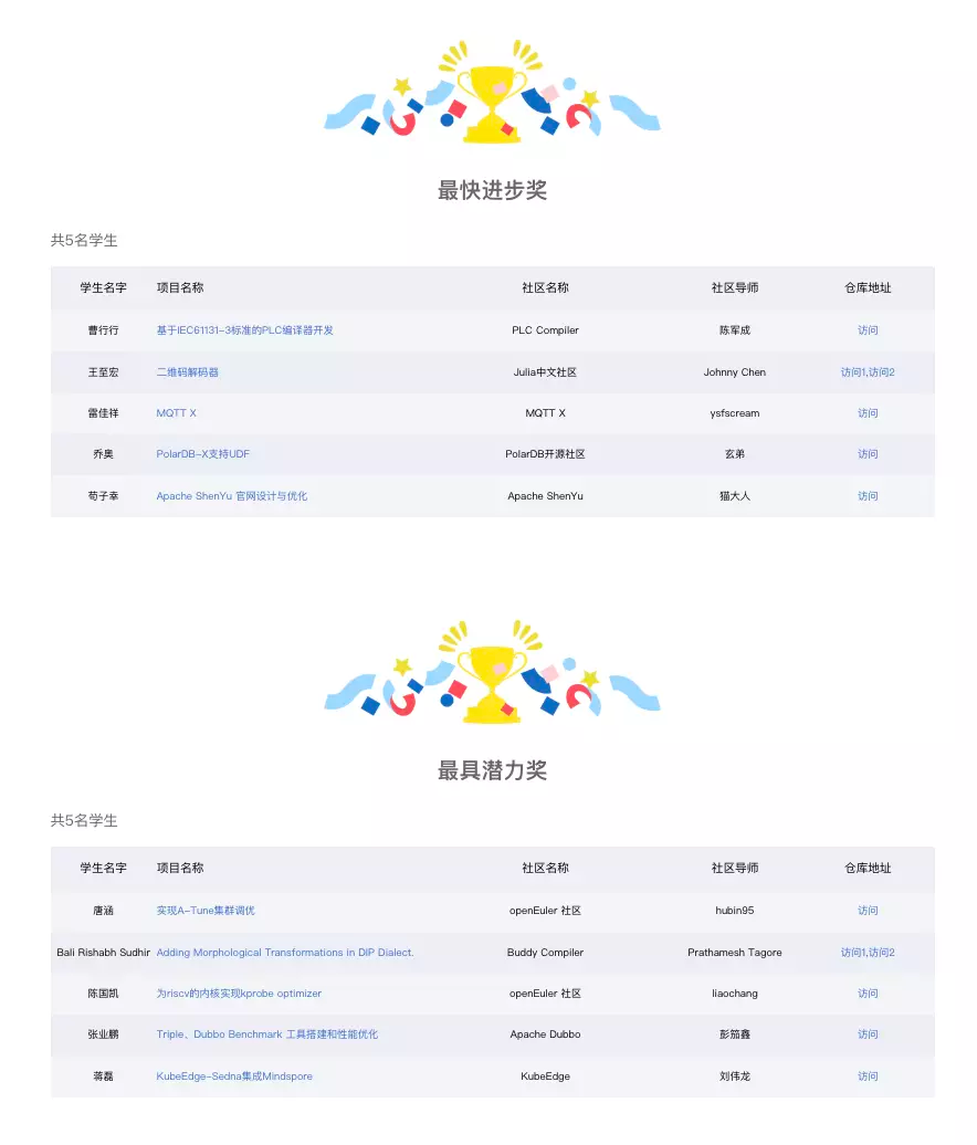 突出贡献奖为社区角度的评选奖项,侧重学生对社区的贡献度、完成项目对社区的重要性等。