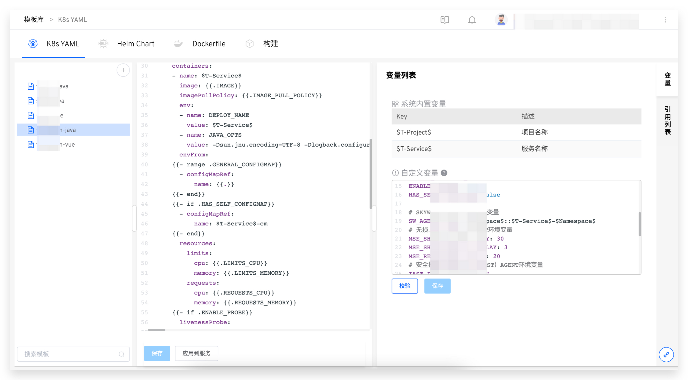 当前 K8s YAML 模板实现的思路是:创建模板后,在服务中选择 使用模板新建 会将模板中的变量内容拷贝到新建页面,点击新建时将会根据模板和复制过来的变量生成 YAML,与模板中的变量无关。
