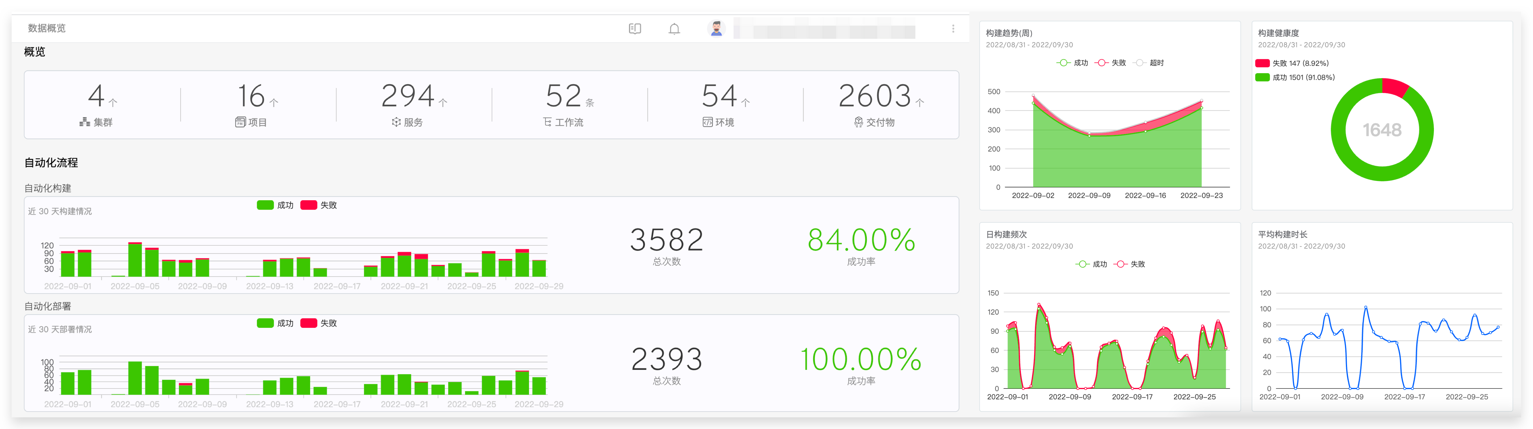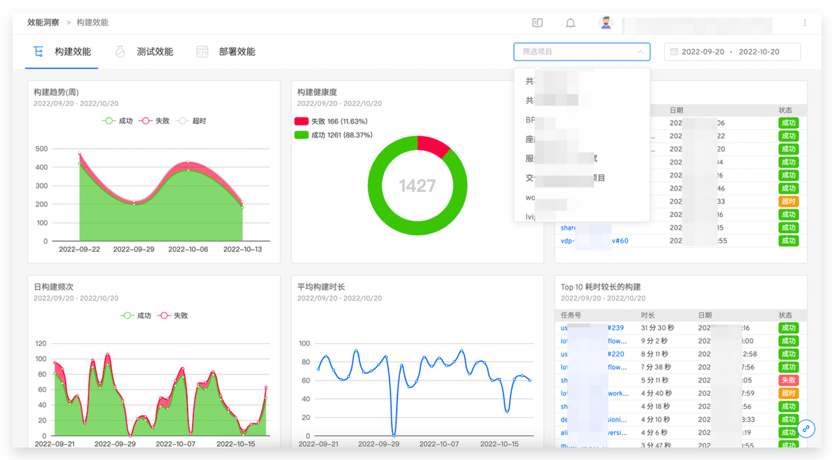 效能洞察弥补了原始方案在数据统计方面的巨大短板,它不仅支持从全局角度查看所有项目的构建、测试、部署情况(适合高级管理者,如 CTO、运维负责人),还支持从单个项目和时间维度进行分析(适合项目责任人,如TL、业务线运维),为研测环节的效率提升程度提供了数据支撑。