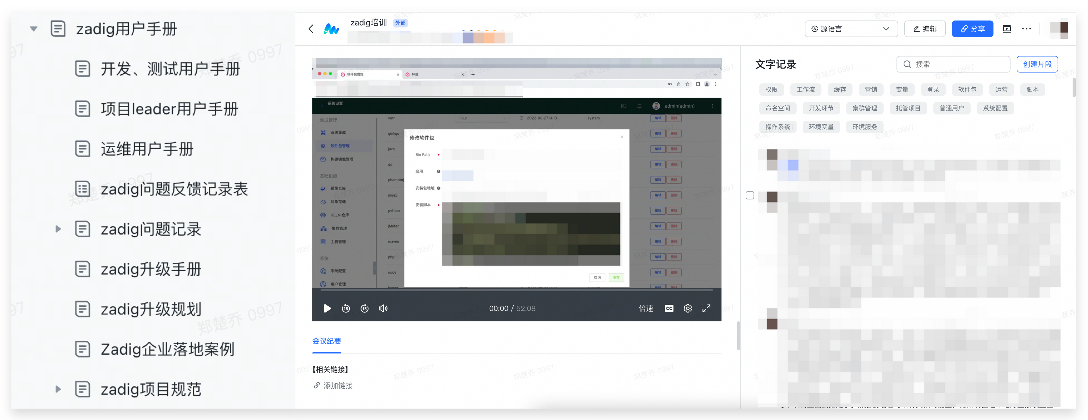 Zadig 落地涉及到的影响范围比较大,无论是从权限还是工作量的角度看,我们的团队都无法独立完成这个工作,如果需要借助外部力量的话,势必需要将我们关于 Zadig 的经验传递给合作方。关于这一点,我们和合作方进行了多次深入的交流和培训,并针对不同的角色编写了使用手册。完善的培训视频和手册大幅降低了我们在落地中后期的沟通成本,并且避免了“口口相传”丢失信息的缺点,让大家可以基于同样的认知进行协作。