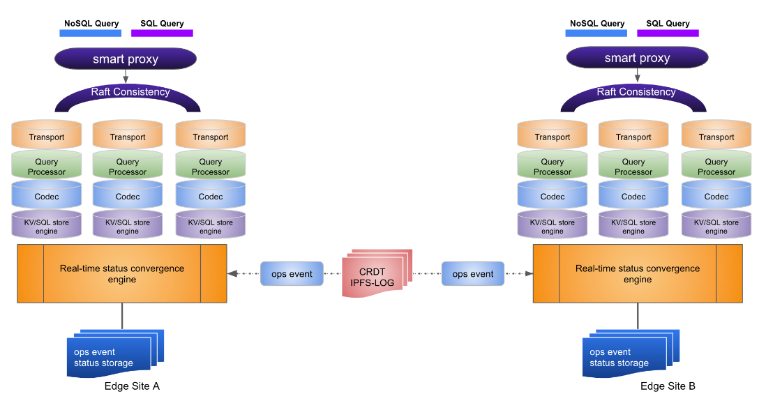 IceFireDB架构的核心是地理分布的事件源和去中心化的Log源,日志级别的CRDT复制。为了实现复制的一致性,IceFireDB提供了一个稳定的去中心化网络模型,允许不同站点之间的公网结合。每个站点内部可以运行多个IceFireDB节点,节点之间可以形成RAFT网络,保证了同一站点内数据的一致性和稳定存储。