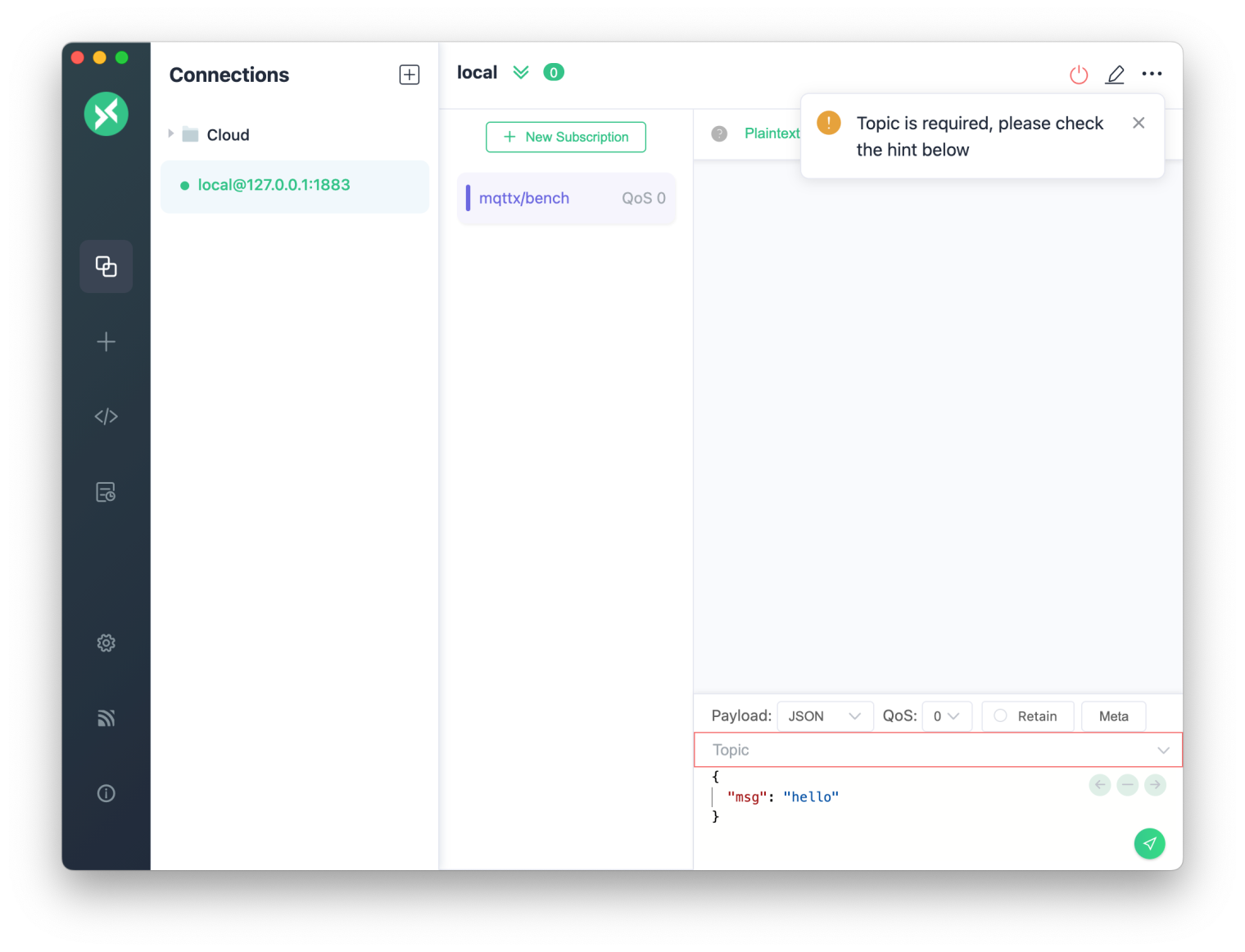 在之前的版本中,很多新手用户在使用时无法快速准确的找到输入主题的地方。当建立连接后,我们需要手动输入主题并填写 payload 后,才能够发送消息。