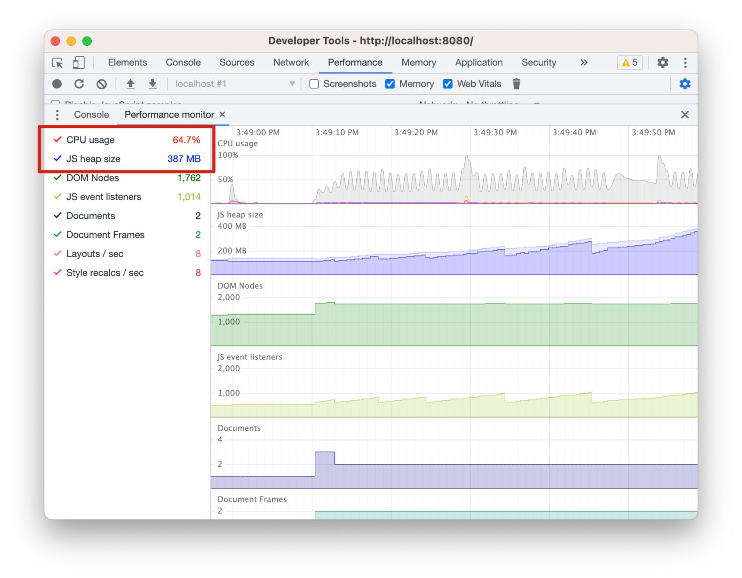 我们使用 MQTT X CLI 的 bench 命令,设置以每秒 100 条消息的速率向 mqttx/bench 主题发布消息,并将 MQTT X 运行在开发环境中,连接上同一个 MQTT 服务,然后订阅 mqttx/bench 主题,最后使用性能监控工具来对 MQTT X 进行性能监控,在差不多同等时间和环境内来对比区分我们在优化前后的性能变化,以便于更好地了解当前的优化效果。