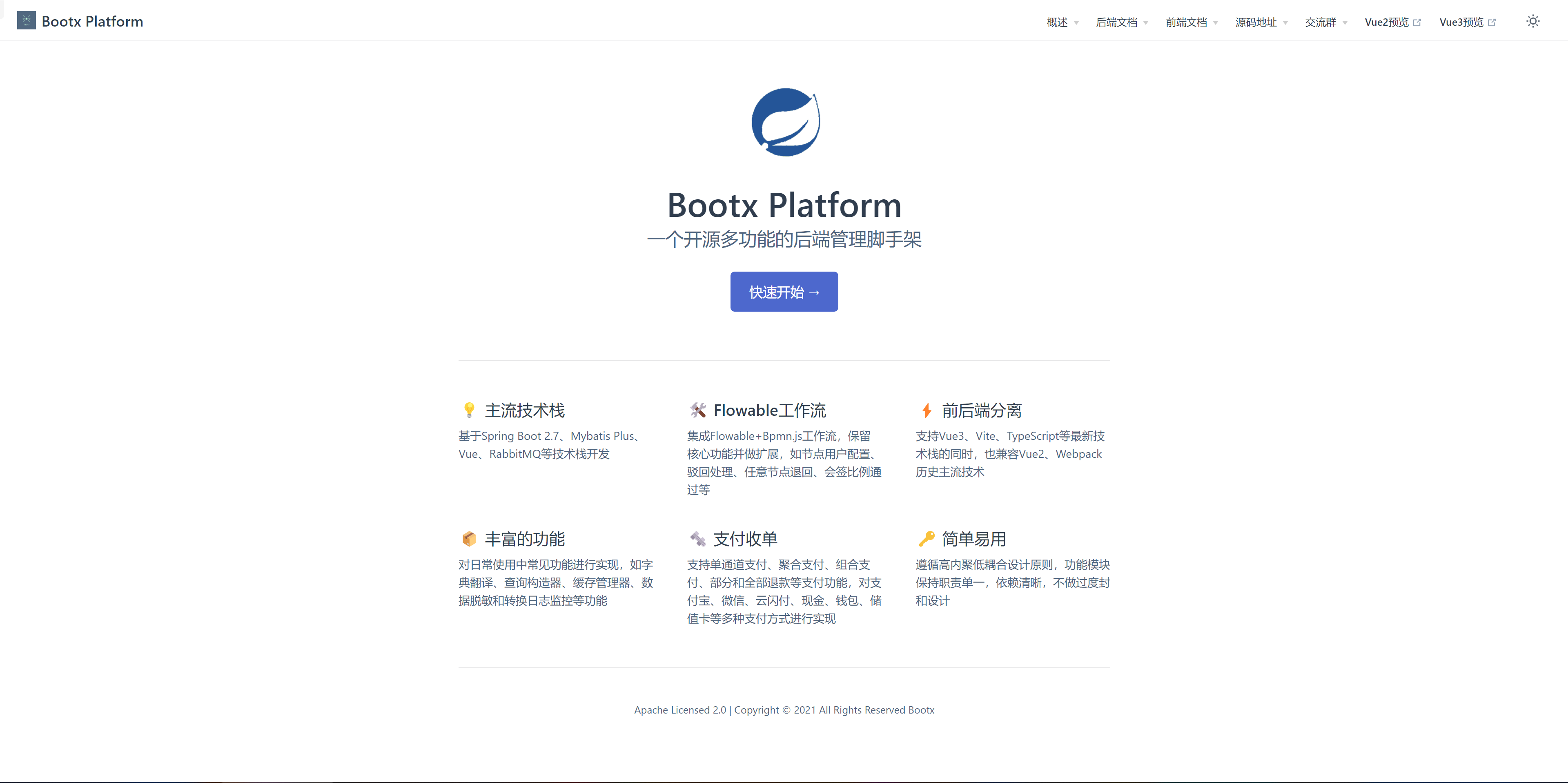 项目地址:https://gitee.com/bootx/bootx-platform,对应文档站地址: https://bootx.gitee.io,不需要关注公众号、也不需要加星球什么的才能查阅,只需打开网站就可以,欢迎能留个 Star 呀🤺🤺🤺