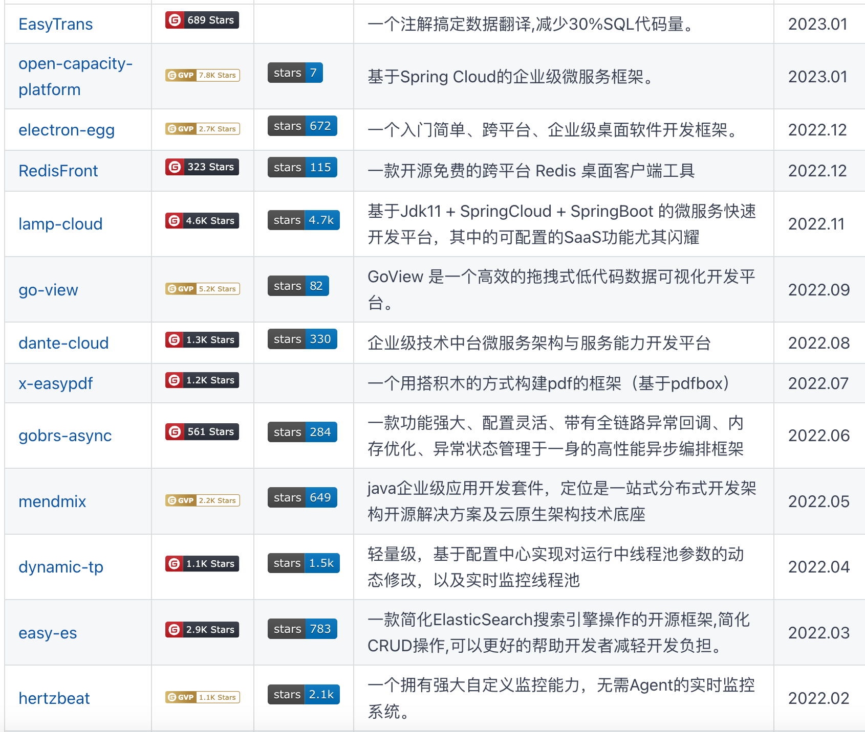 新增 GVP (Gitee最具价值开源)项目 6 个,mendmix, go-view, electron-egg, open-capacity-platform, 其中 LiteFlow, HertzBeat 是这一年 Dromara 社区内部成长起来成为 GVP 的开源项目。目前 Dromara 社区下的 GVP 项目数量已达到 15 个。