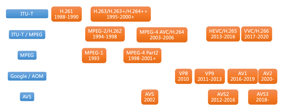 1990 年左右 H.261 标准的制定,开启了视频编解码标准化的历程。经过 30 多年的努力,视频的编码效率得到了极大幅度的提升。在下图中,我们大致列举了一下所有的视频编码标准的制定组织和发布时间。