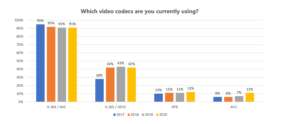 下图是 Bitmovin 连续 4 年的一个编解码器使用调查问卷,我们可以发现,除了 H.264 之外, H.265 也是一个支持度相对较高的编解码标准,而 VP9 和 AV1 也有一定的增长势头。总体来说,H.26x 系列的编码标准,由于其广泛的公司参与和支持,会更加容易得到硬件芯片的实现。但是从 H.265 以来,其专利费的不清晰也成为了他们推广的一大阻力。反之,AV1 从制定初期就定下了免专利费的目标,发展过程中也得到了越来越多的公司支持和加入,我们相信 AVx 系列的支持度也会以一个较为惊人的速度不断发展。