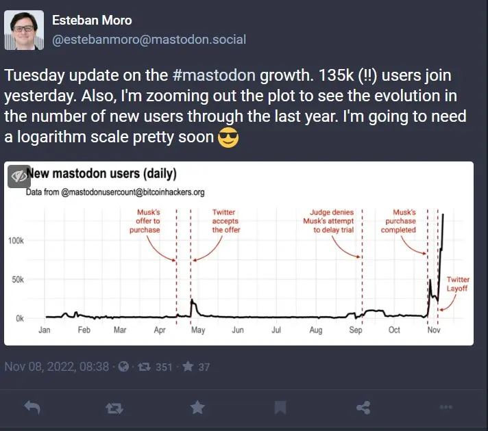 Mastodon 的爆发式增长与马斯克收购 Twitter 密切相关。在马斯克收购 Twitter 前,Mastodon 有大约 50 万活跃用户。在马斯克一系列受争议的操作之后(比如大量裁员、修改 Twitter 验证政策等),Mastodon 在 11 月份涌入了大量用户,高峰时每天新增逾 13 万用户。到 12 月初它的活跃用户数达到了 250 万,但进入 1 月后活跃用户数下降到 180 万。