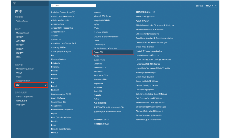 市场上常见的 BI 工具有很多,从软件成熟度和市场接受度考量,我们使用 Tableau 进行探索性数据分析。经过测试,我们可以从 Tableau Desktop 使用 PostgreSQL 驱动访问 PieCloudDB Database。大家可以参考以下步骤进行操作: