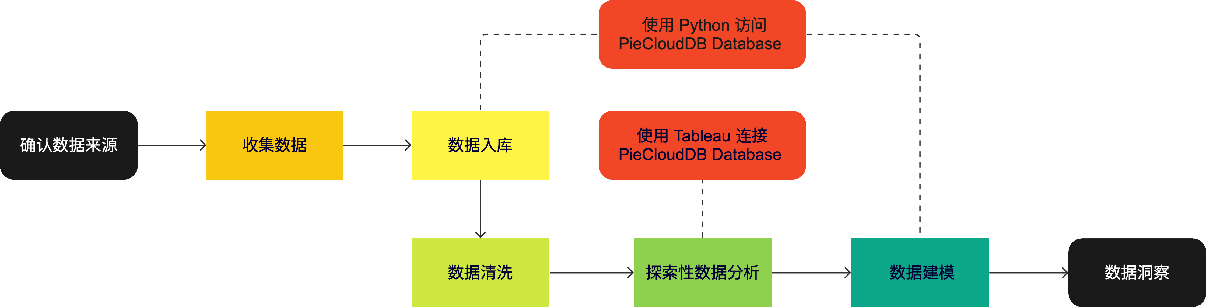 PieCloudDB Database 兼容 PostgreSQL 协议,支持 ODBC、JDBC 等标准数据库接口。对 SQL 的全面支持使得 PieCloudDB Database 可以无缝集成业内常见的 ETL 和 BI 工具;而对多种过程语言(Procedural Language)的支持为用户基于数据库的二次开发提供了便利。的本文将借助一个商业智能场景,介绍如何使用 Python 编程语言和 BI 工具 Tableau 连接 PieCloudDB Database ,从而形成以下完整的商业智能解决方案: