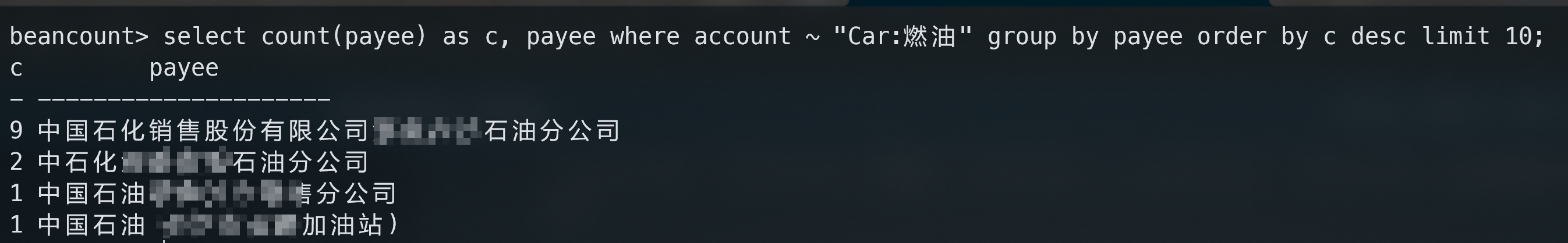 这里分享一下让 Beancount 回答「我都在哪些加油站加过几次油」的操作指令。
