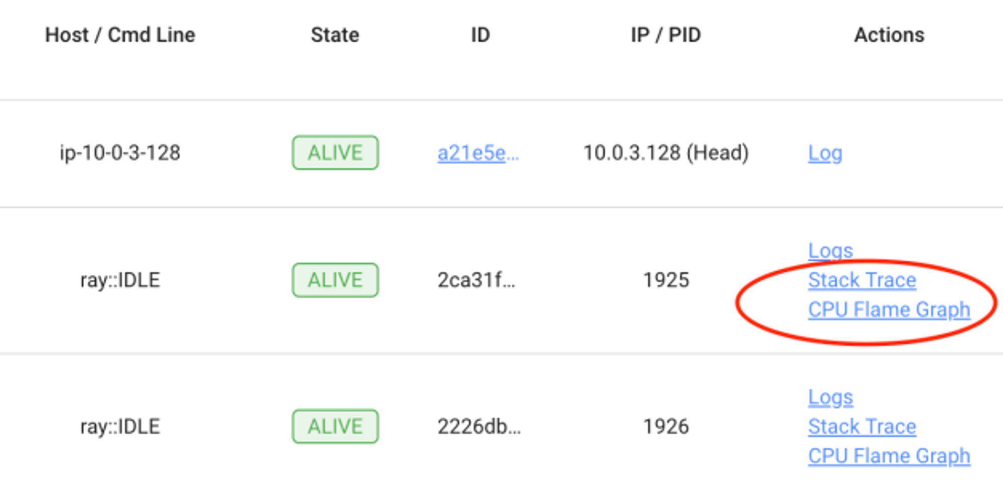 为了观察和衡量 Ray 作业在执行过程中的资源使用情况,Ray 2.2 在 Ray Dashboard 中增加了一些功能,包括可视化 Ray 工作进程的 CPU Flame Graph 和不同内存使用情况的额外指标的功能。