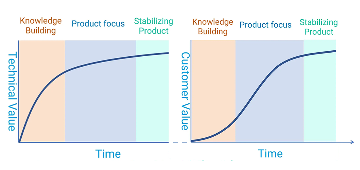 David Theil 根据阶段性目标的不同,将产品生命周期划分为知识构建期、产品成长期和稳定增长期,并绘制了技术价值和用户价值的增长曲线。