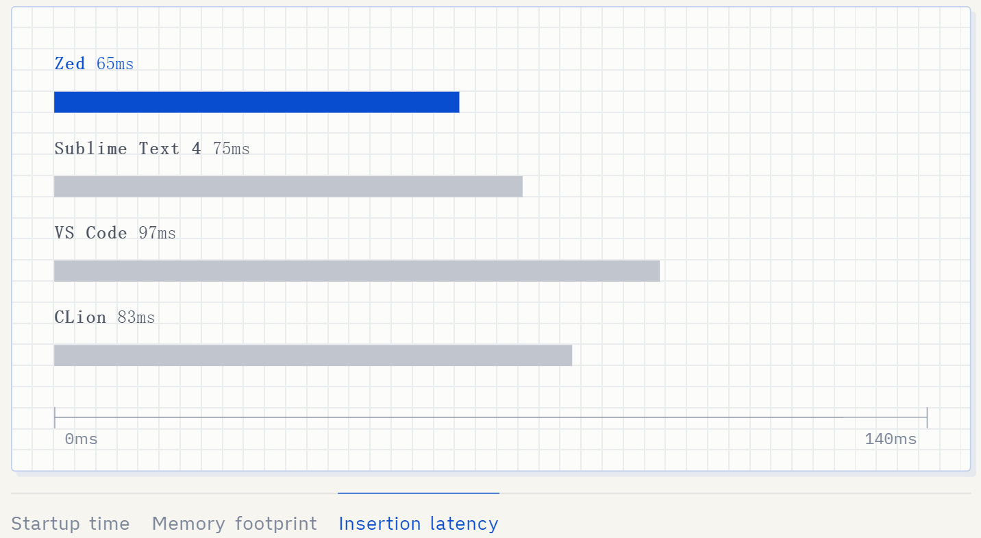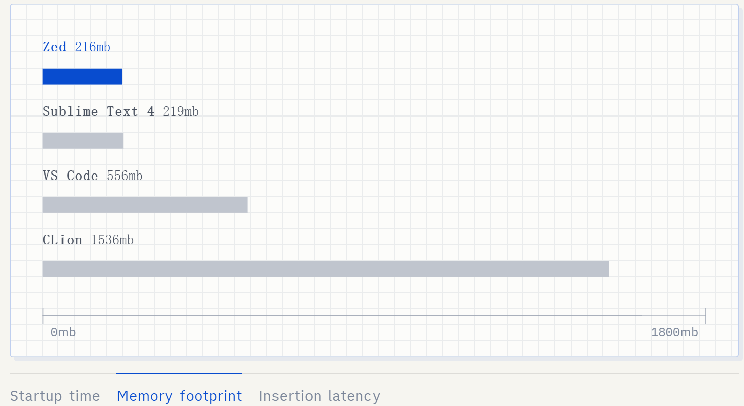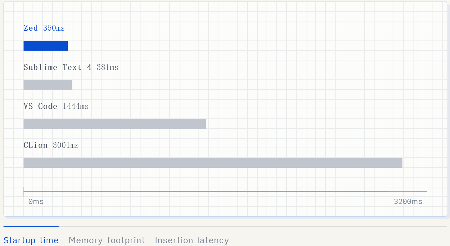 官方提供的性能测试显示,Zed 的启动速度远超基于 Electron 的 VS Code,以及 Sublime Text,且内存占用也是最低的。