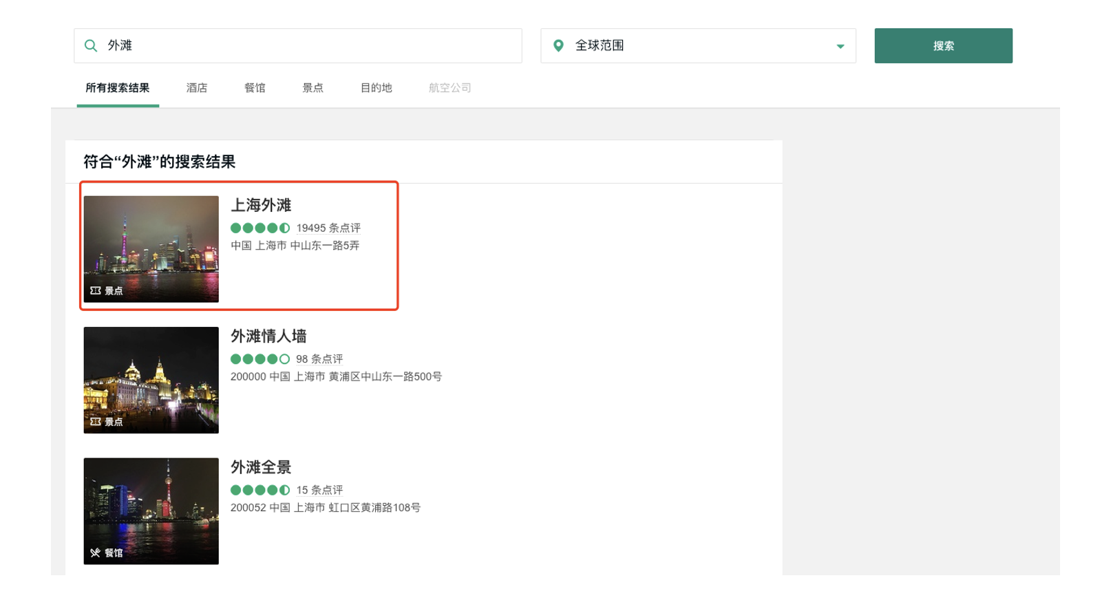 进入猫途鹰主页(https://www.tripadvisor.cn/)后,在搜索栏输入目标景点名称并回车,进入新页面后,在景点列表里根据搜索引擎排序、省份和城市,寻找并点击进入正确的景点页面。这里,我们以“外滩”为例: