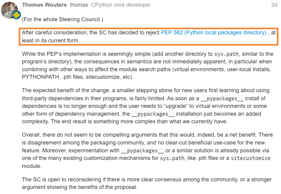 Python 指导委员会拒绝了 PEP 582 提案——Python local packages directory,即本地包目录。