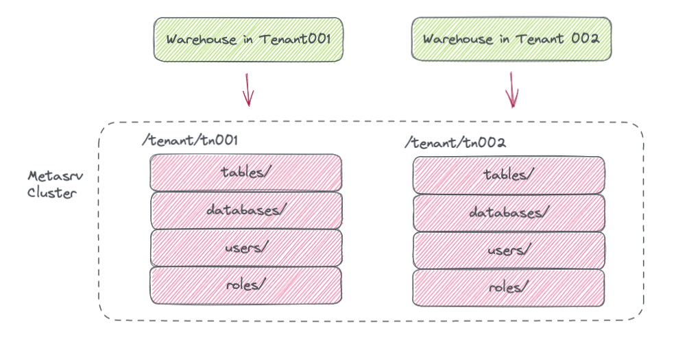 Databend 会尽可能多地缓存从 Metasrv 中得到的元信息,因此对 Metasrv 的访问压力往往并不高。因此我们选择将 Metasrv 部署为多租户的共享集群,通过 Key 前缀来区分不同租户的元数据。