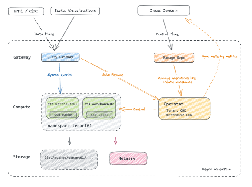 Operator 正是控制面的核心。它主要定义了 Tenant 和 Warehouse 两种 CRD,分别管理租户和 Warehouse 的生命周期。在 Databend Cloud 上创建的 Warehouse,均会对应一个 Warehouse CRD,随后 Operator 会为 Warehouse 创建一个 StatefulSet 以启动 Databend 集群。