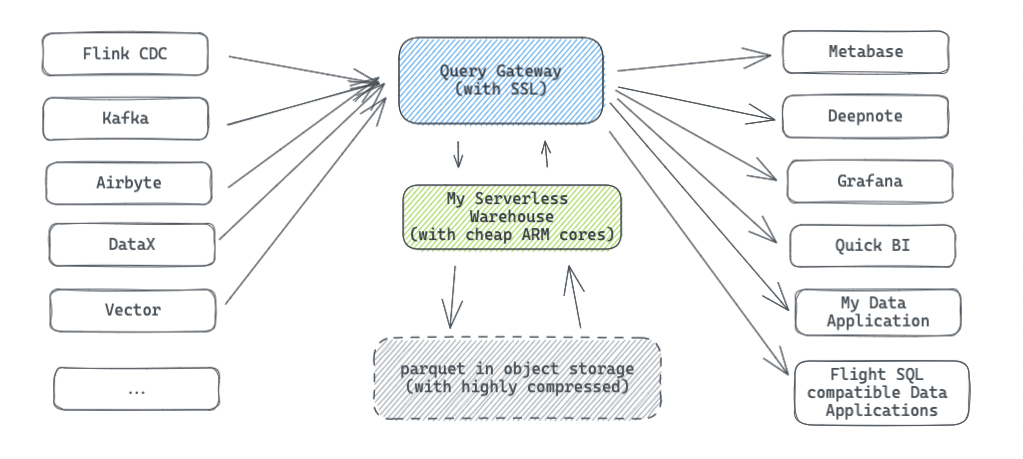不过我们在将自有的 Query 协议与大数据生态集成时遇到了一些困难:我们需要实现不同语言的 SDK、也需要针对诸多不同的系统做一对一的对接,这对于一个新产品而言是一项不小的工作量。目前我们已提供了 Go、Java、Python、Rust 四种语言的 SDK,也提供了 Metabase、Grafana、Quick BI、Deepnote、Airbyte、Kafka、DataX、Flink CDC 等数据系统的对接。我们也开始尝试实现基于 Flight SQL 的协议,借助 Arrow 社区的 SQL 协议标准,使 Databend Cloud 更易于与其他系统集成,与更大的生态相融合。