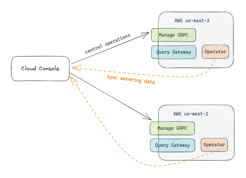 除了控制面流量,额外的一条通信来自用量信息的同步。每个区域内的 Operator 会在收集到 Warehouse 的用量、存储用量的信息后,异步地将用量信息推送给 Cloud Console。Cloud Console 会将用量信息收集集中存储于自己的数据库中,经聚合后生成用量统计数据,并在每月生成账单。