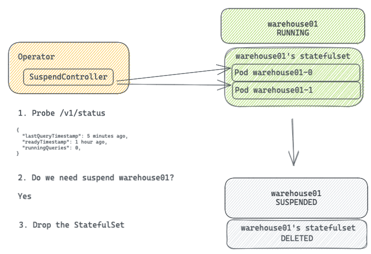 Operator 中的 SuspendController 会持续地检查活跃的 Warehouse 的 Pod,通过 /v1/status 接口获取 Databend 实例的运行状态,若一个 Warehouse 的所有 Pod 均没有活跃查询、且上次活跃的时间超过 Suspend 时长,则删除该 Warehouse 的 StatefulSet 释放计算资源。
