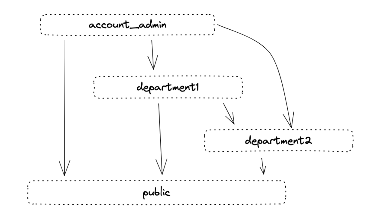在 Databend 中,可以为每位用户绑定多个角色,角色之间可以有依赖关系,不过同一时间中只有一个活跃的 Role。Databend Cloud 中目前内置了 AccountAdmin 和 Public 两种特殊的 Role,分别作为管理员和普通用户使用,它们的特殊之处在于,AccountAdmin 是所有 Role 的父 Role,而 Public Role 属于所有 Role 的子 Role,其层级关系大约如下:
