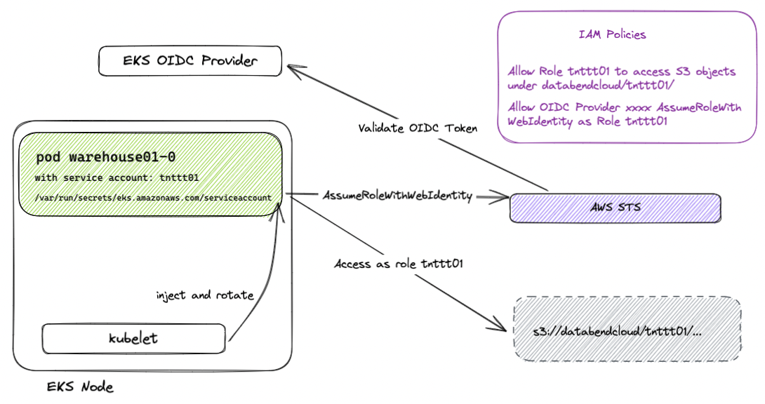 Databend Cloud 平台会在 SetupTenant 时为租户赋予单独的 IAM Role,并通过 IAM 规则限制每位租户只能访问特定前缀下的文件。因为没有长生命周期的 Key 存在,访问 S3 等云上资源时也变得更加安全可信。