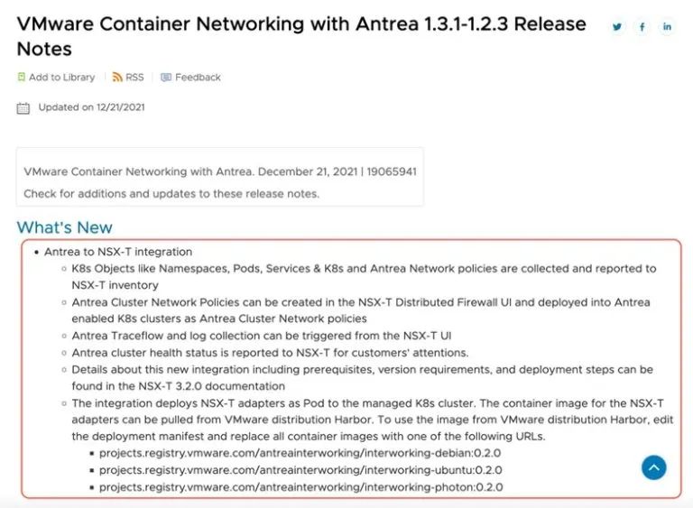上述构件都和我们之前描述标准 Antrea 方案一模一样,唯一要注意的是 Antrea 至 少必须采用 1.2.3 的社群版本,或 1.3.1-1.2.3 的商用版本,才会支持与 NSX 整合的功能,这是大家需要特别在使用此功能前注意的。下图是 VMware Container Networking with Antrea 1.3.1-1.2.3 的 release note(注:标注红框部分就是对于 NSX 整合新功能的描述。)