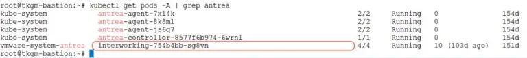下图内大家看到在做完 Antrea + NSX 整合后, Kubernetes Cluster 内会出现一个开头是 interworking 的这个 pod,就是我们这边讨论的 Antrea NSX Adapter。